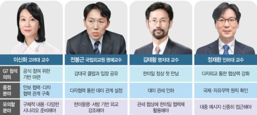 상대국에 대해 치밀하게 파악하고 충분히 대비해야 한다는 의견도 나왔다. 이 교수는 “트럼프 대통령이 이 자리에서 무슨 이야기를 할지 모르는데 우리만 ‘협력하자’는 식의 형식적 이야기로는 할 수 있는 게 없다”고 말했다. 그러면서 “우리가 G7 국가들과 어떤 협력을 할 수 있을지 구체적으로 준비해야 한다”며 “안보 협력 등 예상 가능한 의제에 대해 어떤 식으로 입지를 다져나갈지 시나리오를 많이 만들어가야 한다”고 제언했다.