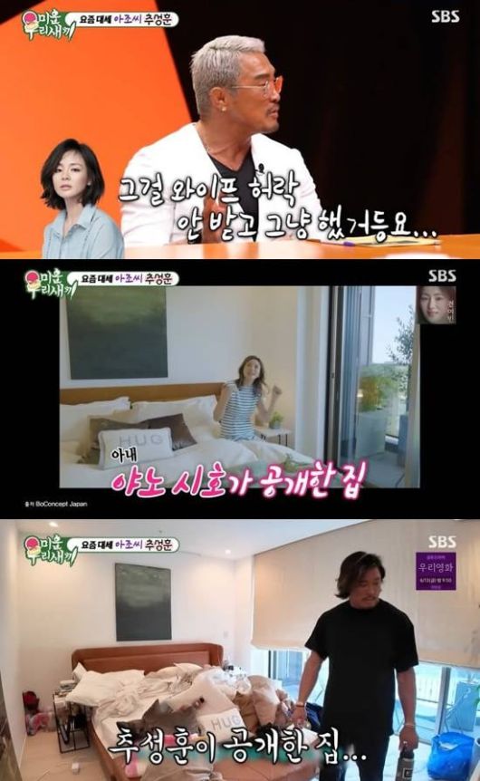 이날 추성훈은 유튜브 채널 개설 후 공개한 도쿄 집 때문에 아내와 가정 불화가 있었다고 밝혔다. 그는 “제작진이 집을 소개해달라고 했다. 편하게 있는 그대로 공개했는데, 와이프 허락을 안 받고 그냥 했다. 예전에 와이프가 방송으로 집을 공개할 때는 깨끗한 상태로 찍어서 나갔는데, 나는 편하게 했다”며 아내가 공개한 일본 방송과 추성훈이 공개한 지저분한 모습의 유튜브 영상이 비교됐다.