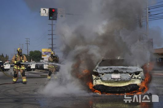 [로스앤젤레스=AP/뉴시스] 6월7일 LA 남부 시외의 교통요지인 콤프턴에서 연방 이민당국의 이민 체포 작전에 대항하는 시위대의 방화로 불타는 차량을 소방대가 진화하고 있다. LA근교에 대한 이민국의 대대적 작전이 이틀째 이어지면서 국경수비대 병력과 시위대의 대치가 전쟁터를 방불케 했다. 2025. 06. 09. |