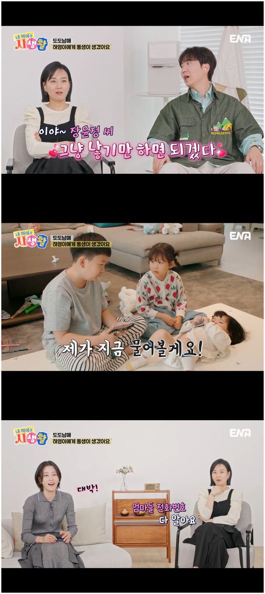 늘 동생이 있기를 바라는 하영과 다감한 오빠인 연우는 아기 이로가 등장하자마자 부끄럽다는 듯 팔짝 뛰었다. 이현이는 “이로는 어쩌다가 이 집에 오게 된 거냐”라며 인연을 물었다. 장윤정은 “하영이가 자꾸 동생이 있길 원했다. 그런데 이로가 외동이라, 언니 오빠가 있기를 바라서 그게 통했다”라고 말했다.
