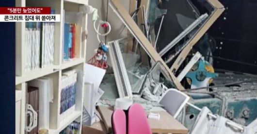 A씨가 공개한 사진을 보면 아이의 방 벽에 책장이 있었고, 그 옆으로 책상이 놓여 있었다. 그런데 천공기가 외벽에 부딪히며 유리창이 깨지고 부서진 벽체가 집 안으로 밀려 들어오면서 끊기고 휘어진 철근이 그대로 모습을 드러냈다. 또 콘크리트 덩어리가 침대로 쏟아져 엉망이 된 모습이다.