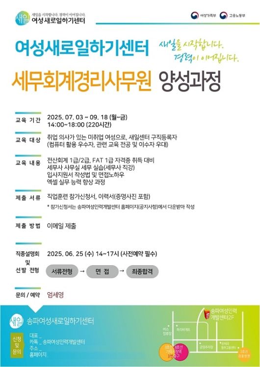 송파여성새로일하기센터는 여성가족부의 지원을 받아 디지털 환경에 적응할 수 있는 실무형 인재 양성을 목표로 ‘세무회계경리사무원 양성과정’을 개설하고 훈련생을 모집한다고 밝혔다.