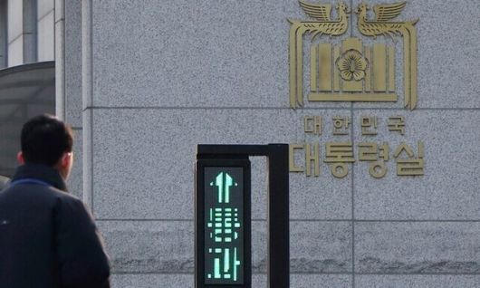 서울 용산구 대통령실 앞에서 관계자들이 이동하고 있다. 대통령실사진기자단 |