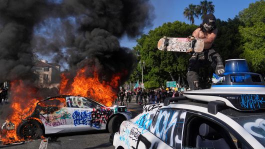 시위대 일부는 LA 현지의 자율 주행 자동차 '웨이모'를 부수고 불을 지르기도 했습니다.