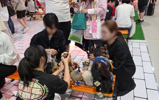 ▲ 가져온 인형을 모아 기념 사진을 남기는 팬들의 모습