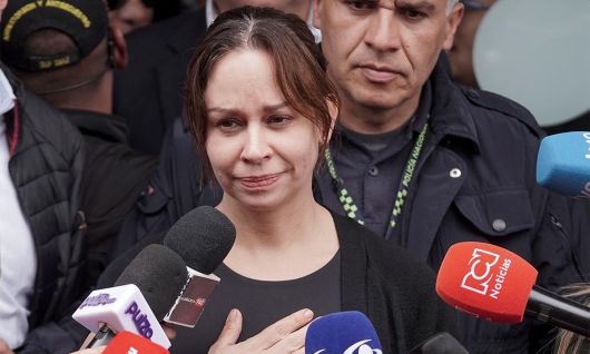 8일(현지시간) 콜롬비아 보고타에서 미겔 우리베 투르바이 콜롬비아 상원의원의 아내 마리아 클라우디아 타라조나가 기자회견을 하고 있다. 보고타=로이터연합뉴스 |