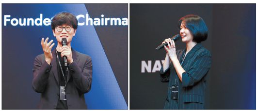 이해진(왼쪽) 네이버 창업자 겸 이사회 의장과 최수연 네이버 대표가 지난 5일(현지시간) 미국 실리콘밸리에서 네이버 벤처스 네트워킹 행사에 참여해 발표를 진행하고 있다. [네이버 제공] |