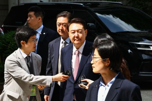 윤석열 전 대통령이 9일 서울중앙지법에서 열린 내란 우두머리 혐의 · 직권남용 권리행사 방해 혐의 사건 6차 공판에 출석하기 위해 차에서 내리고 있다. 사진기자협회 |