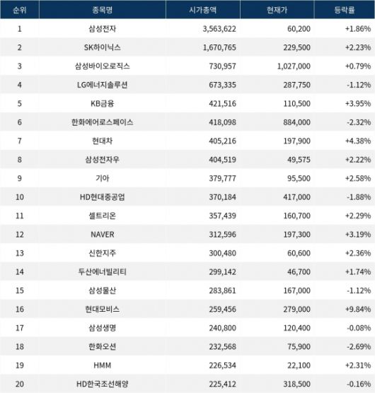 한편, 시가총액 20위권 종목들은 셀트리온(068270) ▲2.29%, NAVER(035420) ▲3.19%, 신한지주(055550) ▲2.36%, 두산에너빌리티(034020) ▲1.74%, 삼성물산(028260) ▼1.12%, 현대모비스(012330) ▲9.84%, 삼성생명(032830) ▼0.08%, 한화오션(042660) ▼2.69%, HMM(011200) ▲2.31%, HD한국조선해양(009540) ▼0.16% 등의 성적을 기록하고 있다.