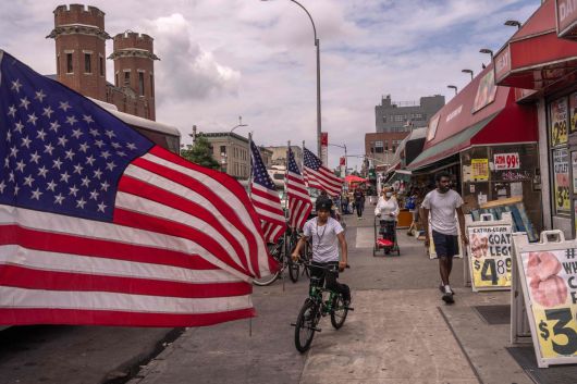 8일(현지시간) 미국 뉴욕 브루클린 자치구의 리틀 아이티 지역에서 사람들이 미국 성조기들이 나란히 세워진 도로를 걷고 있다. [AFP] |