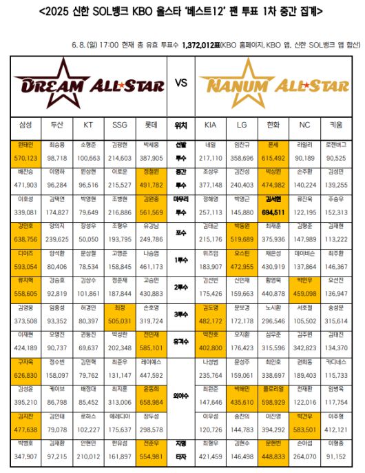 전반기가 진행 중인 가운데 550만 관중을 돌파한 2025 시즌 KBO 리그의 열기는 올스타 팬 투표에도 반영됐다. 1차 중간 집계 결과 총 투표수 137만 2,012표로, 2024 올스타전 1차 중간 집계 때의 128만 2,813표 보다 약 7% 증가했다.