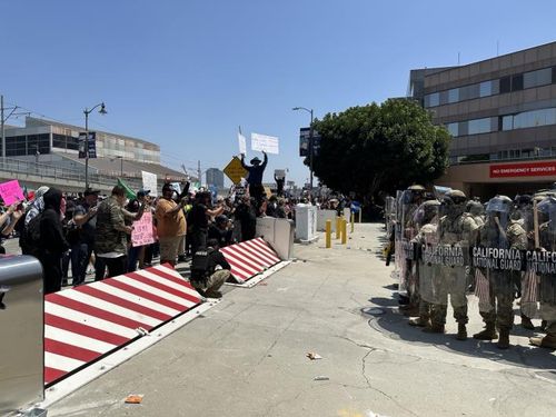 (로스앤젤레스=연합뉴스) 임미나 특파원 = 8일(현지시간) 미국 로스앤젤레스(LA) 도심의 연방 구금시설인 '메트로폴리탄 디텐션 센터'(Metropolitan Detention Center, 이하 MDC) 앞에서 주방위군이 시위대와 대치하고 있다. 시위대는 미 이민세관단속국(ICE)의 대대적인 불법이민자 단속에 반발하는 시위를 사흘째 벌이고 있다. mina@yna.co.kr |