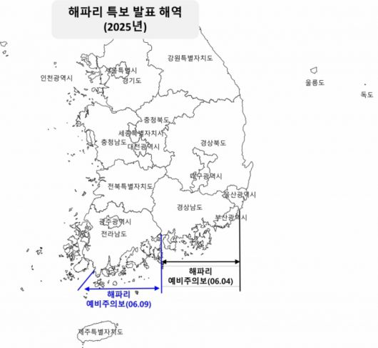 해양수산부가 국립수산과학원의 해파리 예비주의보 특보 추가 발표에 따라 오늘 해파리 대량발생 위기경보를 '관심'에서 '주의' 단계로 격상해 발령했다.