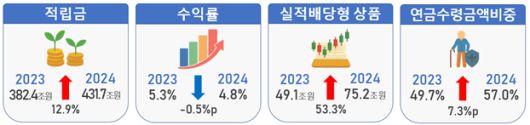 지난해에는 펀드와 ETF 등 실적배당형 상품의 비중이 크게 늘었다. 실적배당형 상품 적립금은 75조2000억원으로 전년 대비 53.3% 증가했다. 실적배당형이 전체 적립금에서 차지하는 비중은 2023년 12.8%에서 지난해 17.5%로 확대됐다.