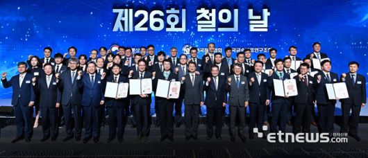 제26회 철의 날 기념식이 9일 서울 강남구 그랜드인터콘티넨탈 파르나스에서 열렸다. 안덕근 산업통상자원부 장관(앞줄 왼쪽에서 여덟 번째부터), 장인화 한국철강협회장 등 내빈과 정부포상 및 철강상 수상자들과 기념촬영 하고 있다. 이동근기자 foto@etnews.com |