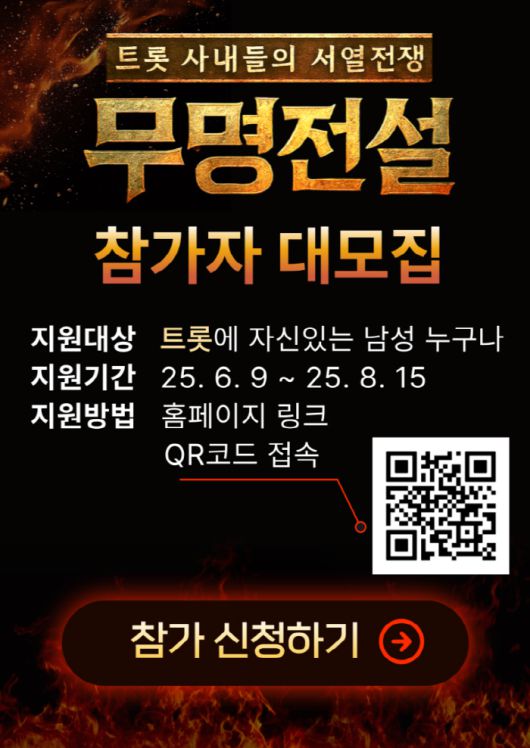 [스포츠조선 조민정 기자] 대한민국 트로트판을 뒤흔들 새로운 스타 발굴 프로젝트가 막을 올린다. MBN이 자체 제작한 새 음악 예능 '무명전설-트롯 사내들의 서열전쟁'이 참가자 모집을 시작하며 대장정의 서막을 알렸다.