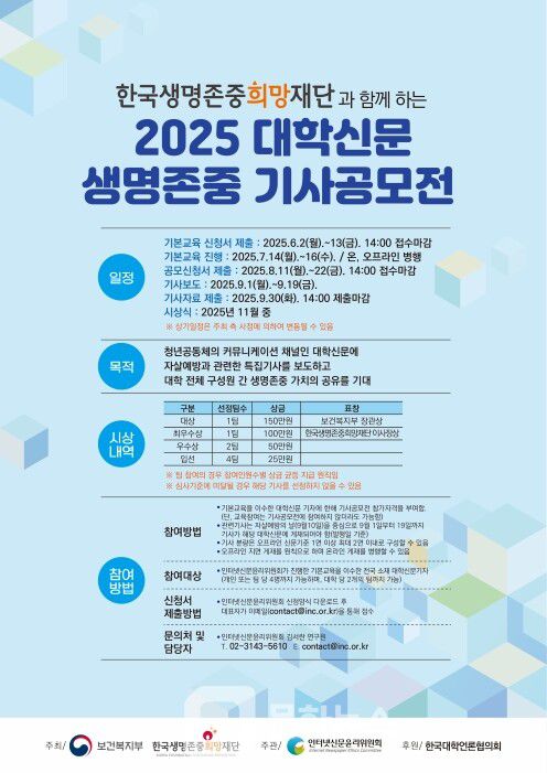 이번 프로그램은 한국생명존중희망재단과의 협력으로 기획됐으며, 대학 사회 내 생명존중 문화를 확산하고 책임 있는 언론 보도의 기준을 세우기 위한 교육 과정으로 마련됐다. 특히 2025년 9월 개최 예정인 '대학신문 생명존중 기사공모전'과도 연계돼 있으며, 공모전에 참여를 원하는 경우 생명존중 관련 교육을 최소 1개 이상 이수해야 한다.