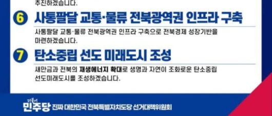 이 중에서 가장 관심을 끄는 공약 중 하나가 바로 6번째 공약인 '사통팔달 교통·물류 전북광역권 인프라 구축'이다. '전북경제의 성장기반을 마련하겠다'는 취지가 덧붙여 있어 더욱 관심을 끈다.