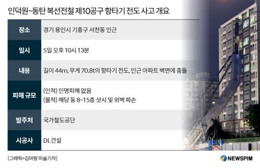 지난 5일 오후 10시13분경 경기도 용인시 기흥구 서천동 인근에서 지하 굴착 공사 가시설 설치 작업을 위해 대기 중이던 길이 44m, 무게 70.8t 규모 항타기가 전도돼 인근 15층 높이 아파트 쪽으로 넘어졌다. 해당 현장 발주처는 철도공단이며 시공사는 DL건설이다.