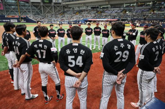LG 선수들이 6일 고척스카이돔에서 열린 2025 KBO리그 키움전에 앞서 미팅을 진행하고 있다. 사진 | LG 트윈스 |