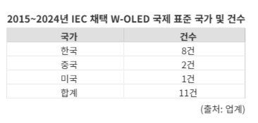 10년 동안 IEC가 인정한 W-OLED 국제 표준이 단 11건이라는 점을 감안하면 무시하기 어려운 수준이다. 해당 기간 채택된 중국의 국제 표준은 2개다. 한국(8건)보다는 적지만 미국(1건)보다 많다. 쉽게 말해 전 세계가 인정한 중국의 '표준화된' 대형 OLED 기술이 2가지로 늘었다는 뜻이다.