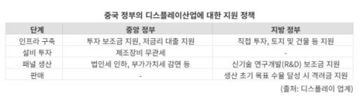 중국 정부는 현재 디스플레이 육성을 위해 △인프라 구축 △설비 투자 △패널 생산 △판매 등 모든 단계에 걸쳐 전방위 지원을 하고 있다.