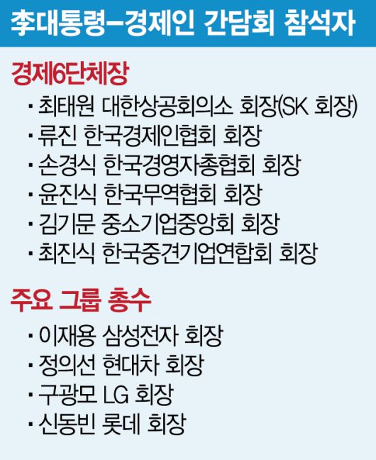 9일 재계에 따르면 대통령실은 12일 또는 13일 이 대통령과 주요 그룹 총수 및 경제단체장이 만나는 일정을 조율하고 있다. 재계를 대표해 대한상공회의소가 일정을 조율 중인 것으로 알려졌다. 회동에는 이재용 삼성 회장, 정의선 현대자동차그룹 회장, 최태원 SK그룹 회장, 구광모 LG그룹 회장, 신동빈 롯데그룹 회장 등 5대 그룹 총수와 대한상의·한국경제인협회·한국경영자총협회·한국무역협회·중소기업중앙회·한국중견기업연합회 등 경제단체장이 참석하는 방안이 논의되고 있다.