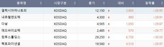 코스닥에서는 갤럭시아머니트리, 헥토파이낸셜, 다날, 컴투스홀딩스, 내츄럴엔도텍, 애드바이오텍 등 6개가 상한가로 마감했다. 하한가를 기록한 종목은 없었다.