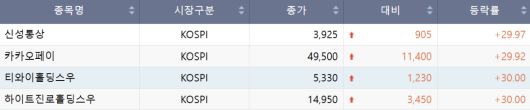 9일 코스피에서 상한가를 기록한 종목은 카카오페이, 신성통상,티와이홀딩스우, 하이트진로홀딩스우 등 4개다. 하한가는 없었다.