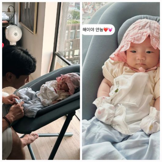 아기 해이는 핑크 보넷을 쓰고 유아용 바운서에 누워 무표정으로 아빠를 응시하고 있다. 이규혁의 다정한 눈빛과는 대조적으로 해이는 미동조차 없이 “무언의 포스”를 풍겨 웃음을 자아냈다.