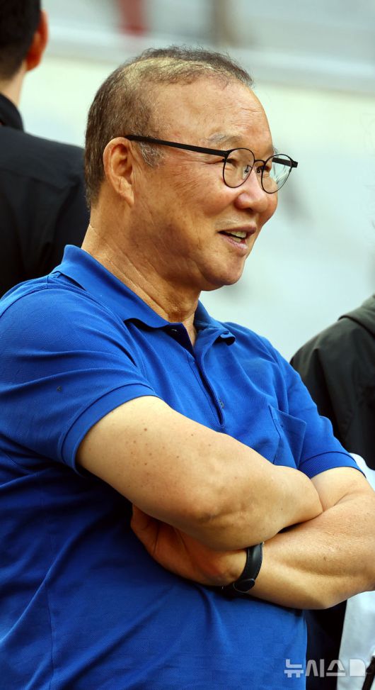 [서울=뉴시스] 박주성 기자 = 9일 서울 마포구 서울월드컵경기장에서 박항서 대한축구협회 부회장이 내일 있을 2026 국제축구연맹(FIFA) 북중미 월드컵 아시아 3차 예선 조별리그 B조 10차전 쿠웨이트전을 대비해 훈련하는 선수들을 지켜보고 있다. 2025.06.09. park7691@newsis.com