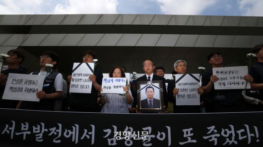 ‘태안화력 김충현 비정규직 노동자 사망사고 대책위원회’소속 노동자들 과 유족이 3일 충남 태안군 한국서부발전 본사 앞에서 진상규명을 요구하며 입장발표 기자회견을 하고 있다. 서성일 선임기자 |
