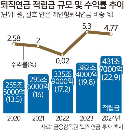 지난해 퇴직연금의 연간수익률은 4.77%로 전년(5.26%)보다 소폭 하락했지만, 물가상승률이나 정기예금 금리를 웃도는 성과를 기록했다. 특히 실적배당형 비중이 상대적으로 큰 DC형(5.18%)과 IRP(5.86%)의 수익률이 두드러졌다.