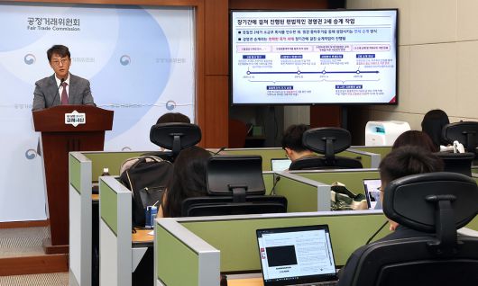 공정거래위원회 최장관 기업집단감시국장이 9일 정부세종청사 공정위 기자실에서 상호출자제한기업집단 중흥건설 소속 중흥건설이 동일인 2세 소유의 중흥토건 및 중흥토건의 6개 계열회사가 시행하고 중흥토건이 단독 시공하는 주택건설 및 일반산업단지 개발사업에서 각 시행사의 PF·유동화 대출에 무상 신용보강을 제공하는 행위에 대해 시정명령 및 과징금을 부과하고, 지원주체인 중흥건설을 고발하기로 결정했다고 밝히고 있다. 연합뉴스 |