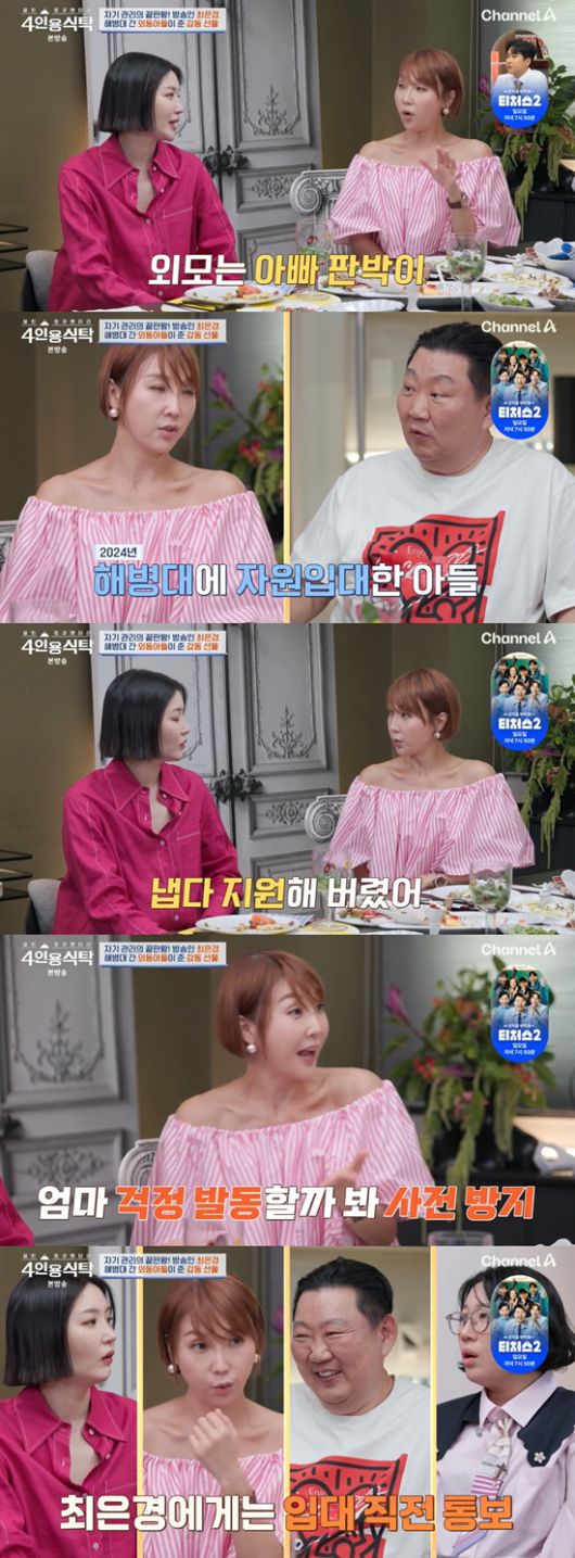 김영희가 최은경에게 "(남편과) 성향이 다른데 아들은 어느 성향이냐"라고 질문했다. 최은경은 "(아들) 외모는 아빠랑 똑같이 생겼는데, 순간순간 내가 두 방울 들어가 있다. 해병대를 자원했다. 해병대 갈 줄은 몰랐는데, 지원해 버렸다. 걱정할 내 성격을 아니까. 나한테는 가기 전에 얘기를 하더라"라고 말했다.