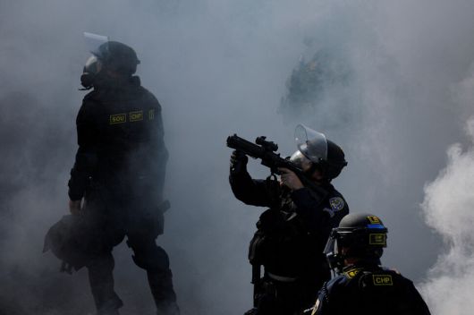8일 미국 캘리포니아주 로스앤젤레스에서 경찰이 시위대를 해산시키고 있다. 로이터 연합뉴스 |