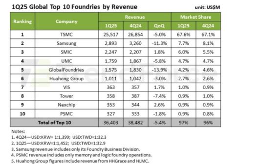 9일 시장조사업체 트렌드포스에 따르면 올해 1분기 글로벌 파운드리 업계의 매출은 364억 달러로 전 분기(385억 달러)보다 5.4% 감소했다. 1분기는 계절적 비수기인데 미국의 상호 관세 면제 시한을 앞두고 고객사 주문이 집중되고 중국의 소비자 보조금 프로그램이 연장되면서 매출 감소가 예상보다 크지 않은 것으로 풀이된다.