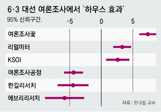실제로 조사 방식 간 차이보다 업체 간 차이가 더 컸다. 1, 2위 후보 간 지지율 차이를 기준으로 조사업체별 ‘하우스 효과’를 보면 여론조사꽃(+7.4%포인트), 리얼미터(+3.3%포인트), KSOI(+2.6%포인트) 등은 이재명 후보 지지율 우위를 과대 추정했다. 결과적으로 여론조사꽃은 16.6%포인트 차로 이재명 후보가 승리할 것으로 예측한 셈이다. 반면 에브리리서치(―5.8%포인트), 한길리서치(―4.5%포인트), 여론조사공정(―4.4%포인트) 등은 이재명 후보의 우위를 실제보다 절반 가까이 과소 추정했다. 그러나 ARS와 면접조사 업체 간 체계적인 차이는 발견되지 않았다.