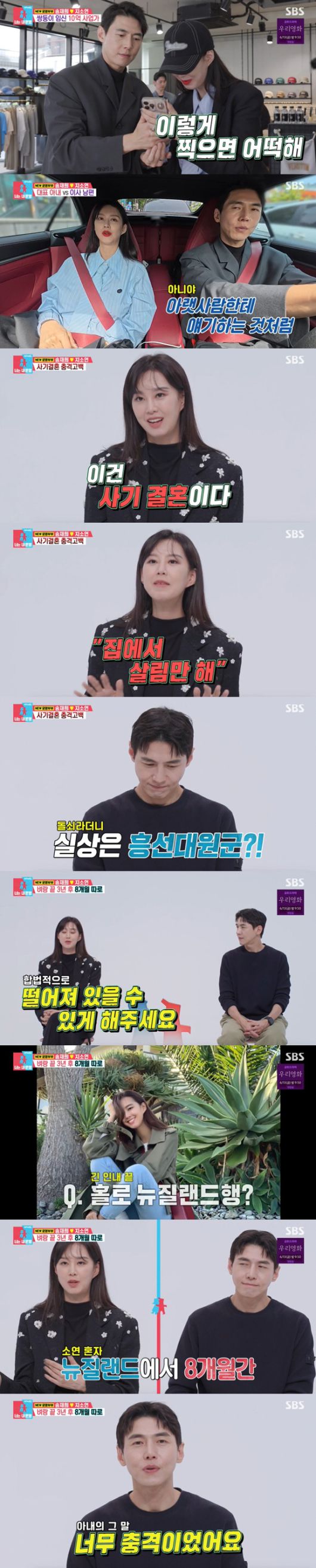 그러면서 지소연은 "저는 그런 일도 겪었는데, 제 말투 때문에 서운해하다니"라며 "사기 결혼이라고 했었다"고 입을 열었다. 그는 "결혼하니까 다 잡은 물고기한테 밥 안준다는 말이 무슨 말인지 알겠더라. 남편이 그때는 보통 아니었다. 남편이 원하는 것을 계속해서 저한테 강요하는게 힘들었다. 이렇게 입고, 이렇게 말하고, 이렇게 머리 자르라고 강요했다. 유교보이처럼 굴었다. 남편에게 설득할 수 있는 포인트가 없었다. 하나부터 열까지 모든 행동을 간섭했다. 친구들 만나는 것도 하지 말고 집에서 살림만 하라고 했다. 남의 집에 세 들어 사는 느낌도 들었다. 신혼 초에 저의 희생이 있었다고 생각한다"며 신혼 초 송재희의 민낯을 폭로했다. 이에 송재희는 "가부장적인 가정 환경의 영향이 있었다. 돌이켜 생각해보니 제 행동이 너무 잘못된 것 같다"고 반성했다.