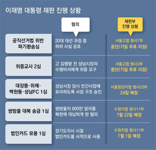 이재명 대통령의 공직선거법 위반 사건 파기환송심이 사실상 중단됐다. 이 대통령 재임 기간 중엔 재판이 열리지 않을 것으로 보인다.