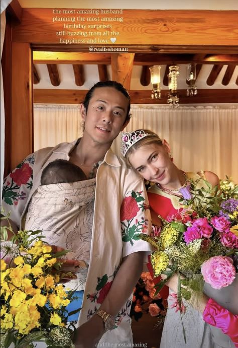 사진 속 빈지노는 아기띠로 아들을 품에 안은 모습. 미초바는 빈지노가 준비한 꽃다발을 품에 안고 어깨에 기대어 있다. 장난감 악세사리와 왕관 등으로 파티룩을 완성해 눈길을 끈다.