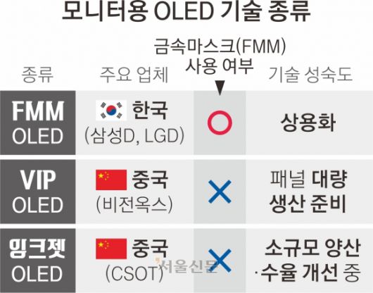 액정표시장치(LCD) 시장에서 우위를 점한 중국 디스플레이 업체들이 유기발광다이오드(OLED) 시장까지 빠르게 영향력을 넓히며 국내 업계에 위협이 되고 있다. 특히 삼성디스플레이와 LG디스플레이가 주도해온 대형 OLED(TV·모니터) 분야에서 중국이 ‘금속마스크(FMM)-Free’ 신기술을 앞세워 모니터 시장을 중심으로 공세에 나서고 있다.