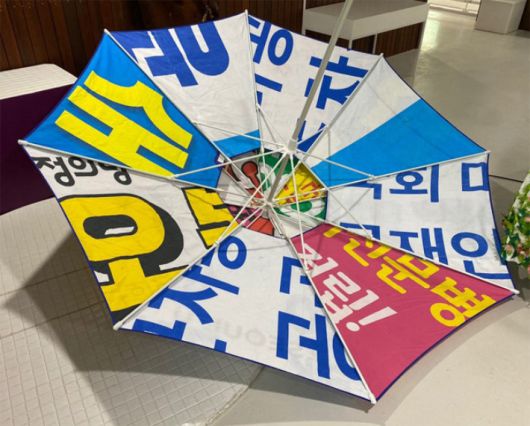 2020년 4·15 총선 이후 서울시가 서울새활용플라자 입주기업들과 폐현수막으로 만든 파라솔. 서울시 제공 |