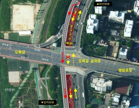 오목교(동측) 지하차도 성산대교→일직방향 2개 차로가 폐쇄됨에 따라, 차량은 기존 지하차도 대신 상부도로 2개 차로를 이용해 새로 설치된 오목교 평면교차로를 통해 주행하면 된다. 오목교교차로에는 가로형 3색 신호등 4개소가 신규 설치돼, 신호체계에 따라 안전하게 주행하면 된다.