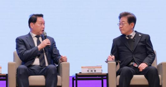 최태원 대한상공회의소 회장(왼쪽)이 지난달 8일 오전 서울 중구 대한상공회의소에서 열린 '이재명 더불어민주당 대선후보 초청 경제5단체 간담회'에서 정책 제언을 하고 있다. [사진=유대길 기자] |