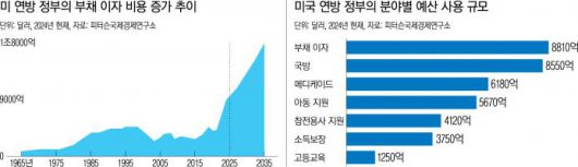 문제는 누적돼 온 정부 부채의 덩치가 너무 커지다 보니, 어느 순간부터 재정 적자에서 이자 비용이 차지하는 비중이 감당하기 어려운 수준으로 확대됐다는 점이다. 2024년 미 정부는 순전히 이자 비용으로만 8810억달러(약 1196조원)를 지출했다. 국방 지출(8550억달러)을 이미 뛰어넘었다. 미 의회예산국(CBO)의 추산에 따르면 미 정부 이자 비용은 올해 9520억달러로 늘어나고, 2026년에는 1조달러로 사상 최고치를 경신한 후, 2035년에는 1조8000억달러를 찍을 것으로 전망된다. 10년 후에는 재정적자의 70%가 순전히 이자를 갚기 위해 내는 빚이 될 것이란 뜻이다.