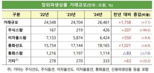 10일 금융감독원이 발표한 '2024년 금융회사 장외파생상품 거래현황'에 따르면 작년 국내 금융회사의 장외파생상품 거래규모는 총 2경6461조원으로 전년 대비 1758조원(7.1%) 증가해 역대 최대규모 기록했다. 장외파생상품 거래규모는 2021년 1경8146조원에서 2022년 2경 4548조원, 2023년 2경4704조원을 기록하는 등 꾸준히 증가했다.