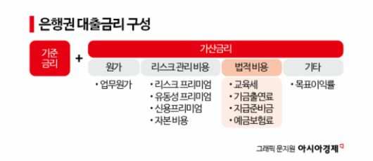 10일 금융권에 따르면 신정부는 가계와 소상공인의 은행권 대출이자 부담을 낮추기 위해 은행 가산금리를 조정할 계획이다. 가산금리는 은행이 대출금리 등을 정할 때 지표(기준)금리에 덧붙이는 위험가중 금리를 말한다. 더불어민주당은 은행이 가산금리를 산정할 때 교육세와 기금출연료, 지급준비금, 예금보험료 등 각종 법정 비용이 전가되지 않게 은행법 개정을 추진할 것으로 예상된다.