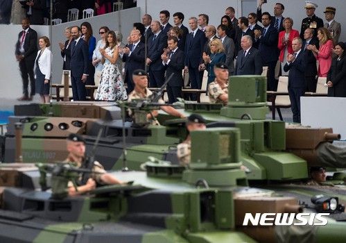 도널드 트럼프 미국 대통령과 에마뉘엘 마크롱 프랑스 대통령(각각 첫줄 왼쪽에서 네번째, 다섯번째)이 14일(현지시간) 파리 샹젤리제에서 열린 프랑스 대혁명 기념일 퍼레이드를 지켜보고 있다. 2017.7.15./AP=뉴시스 |