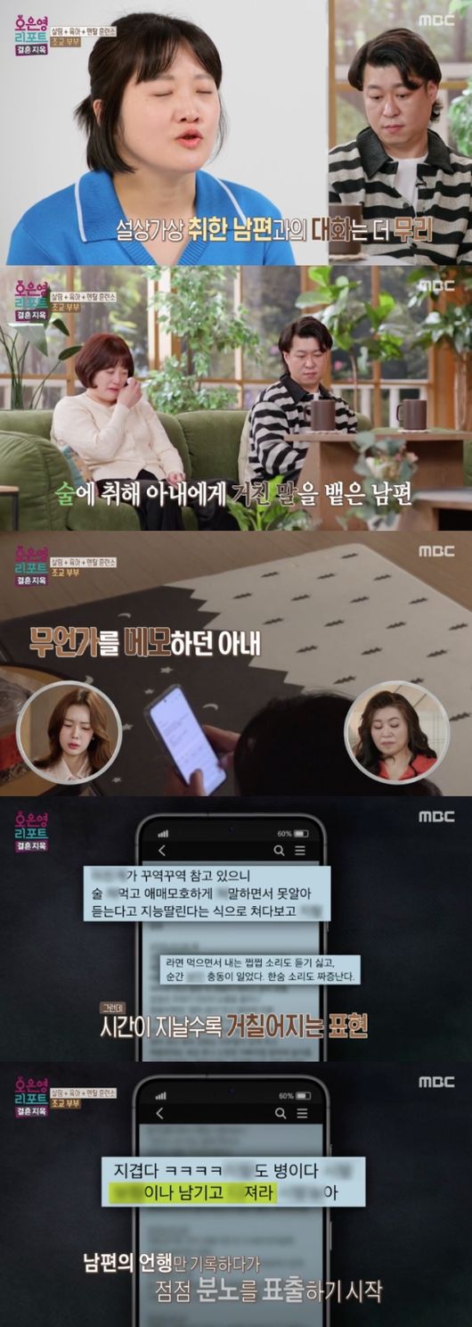 아내는 지속적으로 남편에게 힘든 마음을 토로했지만 돌아오는 것은 남편의 폭언이었다. 결국 아내는 쓸쓸한 마음을 술로 달랬다. 아내는 휴대폰에 메모를 잔뜩 했다. 올해 1월부터 쓰기 시작했다는 일기장. 남편의 말에 상처받을 때마다 기록했다는 아내. 내용이 공개되자 모두가 충격에 빠졌다. 남편의 언행만 기록하다가 점점 격해지는 속마음까지 기록했다.